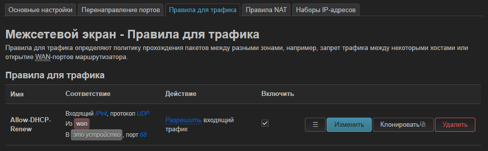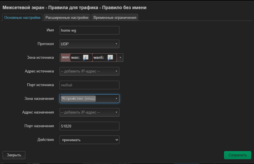 и добавляем правило. Имя какое хотим, протокол udp, источник wan зона, назначение это устройство, указываем порт который указывали в интерфейсе, действие принять