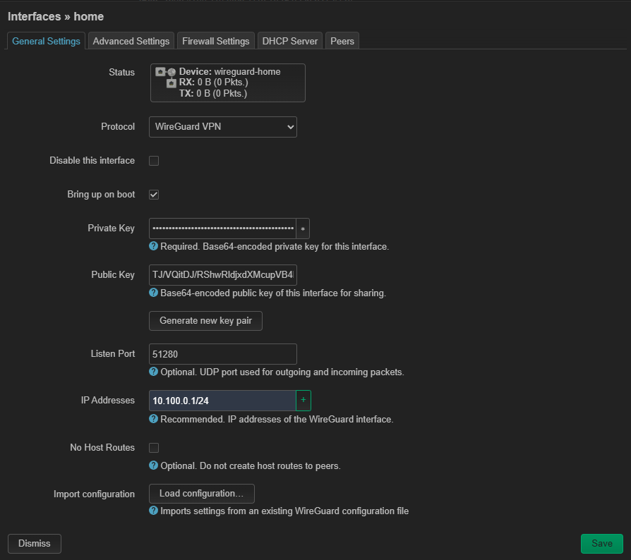 Далее генерируем ключи (Сгенерировать новую пару ключей) и назначаем сеть интерфейсу(IP addresses) и порт. маска /24 обязательна. порт любой начиная с 1025 до 65534