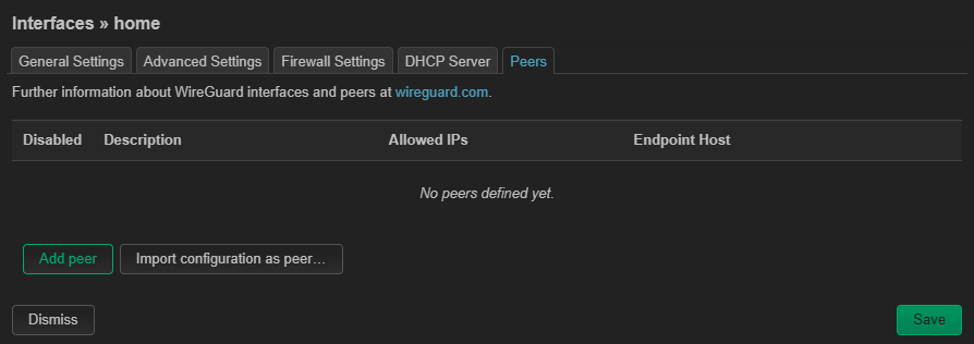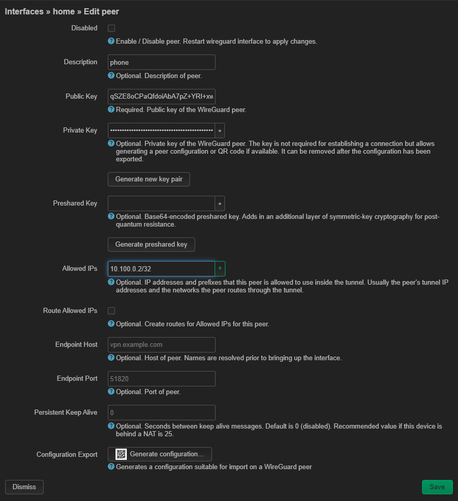 Далее даем имя, генерируем ключи пиру(generate new key pair) и задаем ему ip адрес(allowed IPs). маска обязательно /32