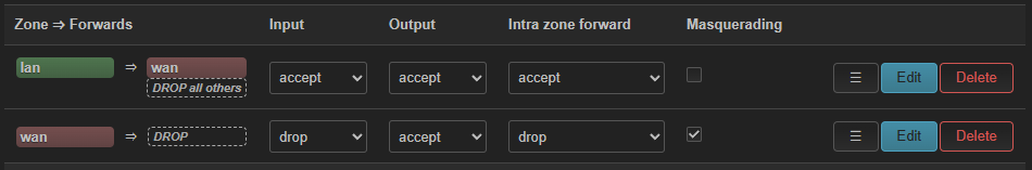 Далее идем сеть (network) — межсетевой экран (firewall) и в зонах ставим принять принять принять у зоны lan